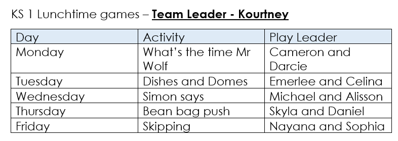 As a Play Leader, you will be responsible for organising games and activities for the younger children on the KS1/top playground. Activities include skipping, hula hooping and even cheerleading! You will have one lunchtime duty every week so for example your duty may be every Monday and you will be in charge of the skipping activity.