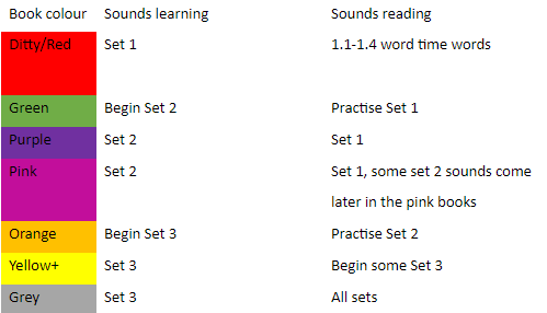 Children will continue to be introduced to RWI books starting with Ditty moving through to grey books when they successfully begin to read single words. The short vowels should be kept short and sharp: