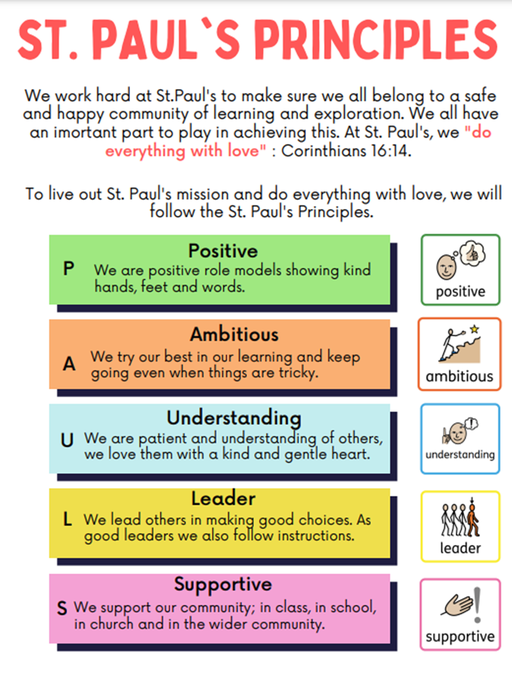 This year we have a new behaviour policy all focused around our new St Paul’s Principles. These will help us to celebrate all the positive behaviours we want to see around school. Have a look at our poster to find out more!