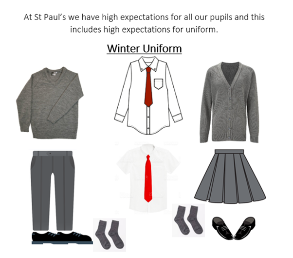 White long/short-sleeved shirt with a red tie (ties are available from the school office) Grey trousers, Grey skirt/pinafore with grey tights Grey V-necked jumper/cardigan Grey or white socks Black leather/leather style shoes Black boots with low heel can be worn with trousers (Not skirts/pinafores) NO trainers allowed |